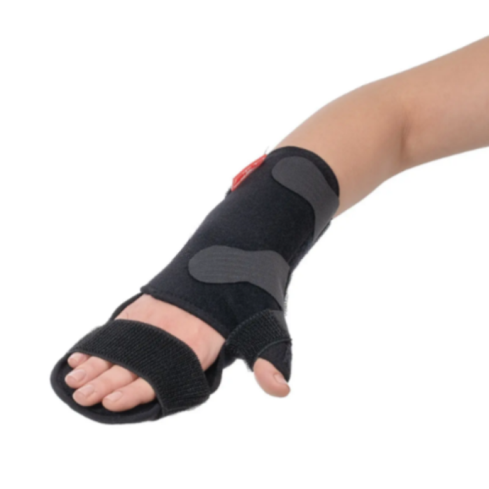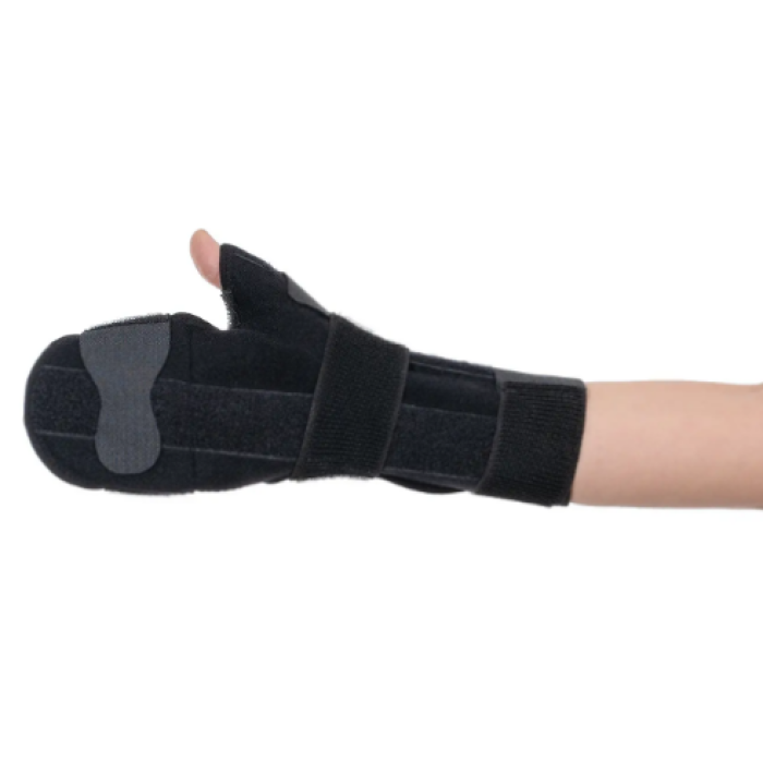 Csuklóízület bandázs. Az ortézis nyújtott helyzetben rögzíti a csuklót, kezet és az ujjakat. Ezt lehetővé teszik a kivehető fém merevítők. A kényelmes kéztartás érdekében a fémlemezek helyén vékony habszivacs betétek találhatók.