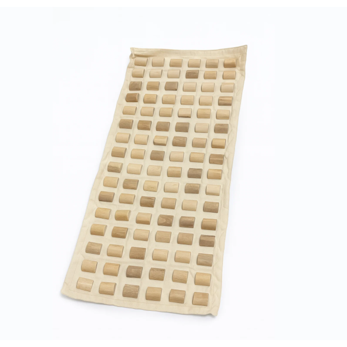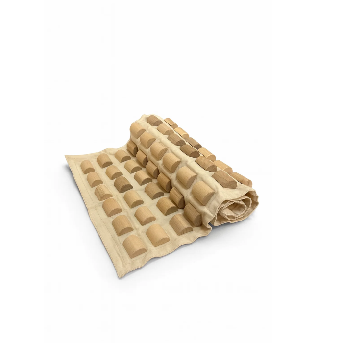 A masszázs szőnyeg sűrű lenvászon anyagból készült, amelyre bükkfából faragott félhengerek vannak rögzítve. A fa elemek szilárdan illeszkednek az aljzathoz.