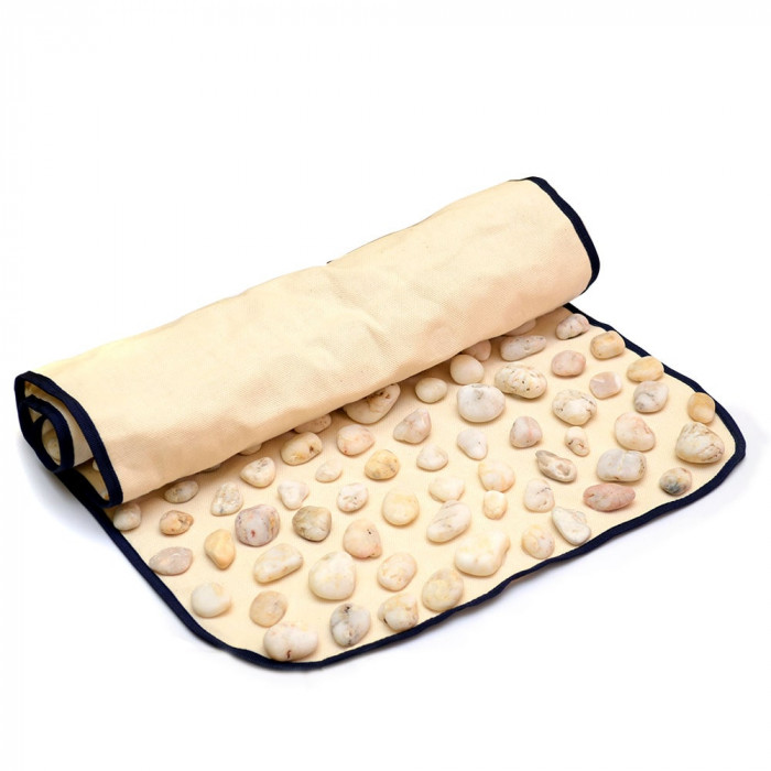 A talpmasszázs szőnyeg fekete-tengeri természetes kavicsok felhasználásával készült. A szőnyeg alapja természetes vászon, a ragasztó szagtalan, nem mérgező, a kavicsok szilárdan vannak rögzítve.